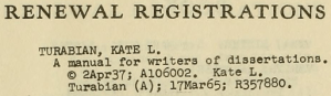 Maybe earlier printings didn’t carry a copyright notice, but that seems unlikely. For one thing, the copyright for Turabian was apparently renewed on schedule (28 years after first publication), as recorded on page 1103 of the US Copyright Office’s Catalog of Copyright Entries, 3rd ser., vol. 19, pt. 1, no. 1 (Library of Congress, 1968), for books and pamphlets registered from January through June 1965.*