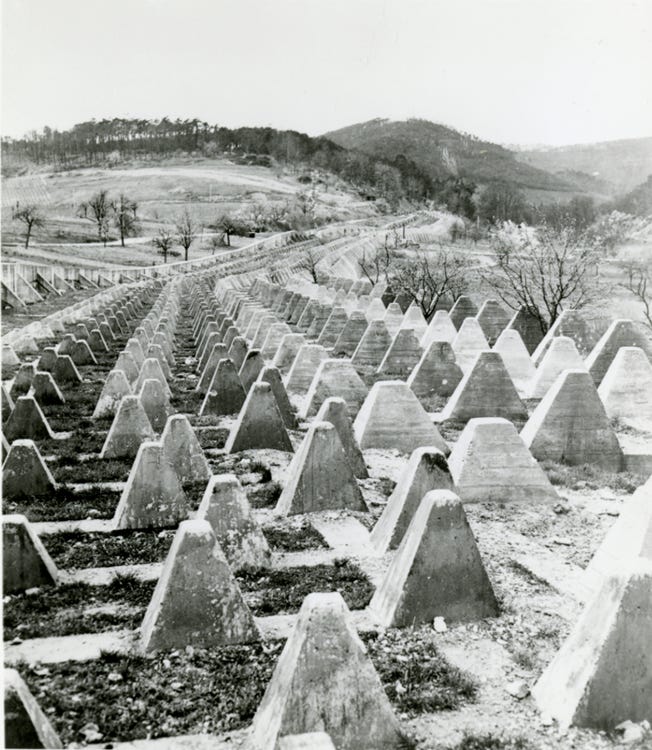 Dragon’s teeth, one of the most recognizable obstacles used in the Siegfried Line, near Wissembourg, France. Courtesy The National WWII Museum